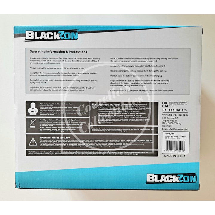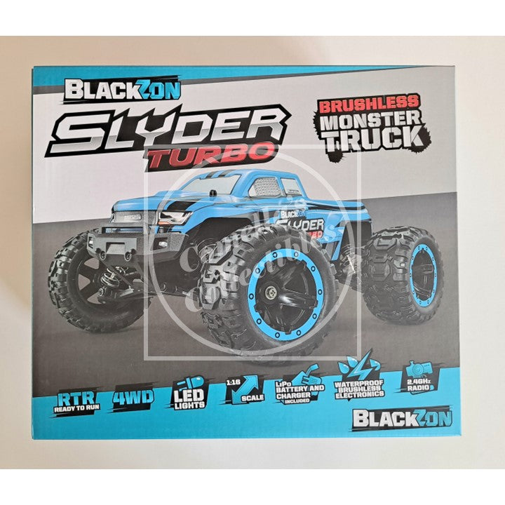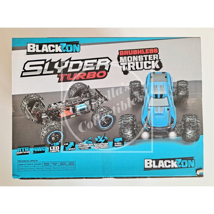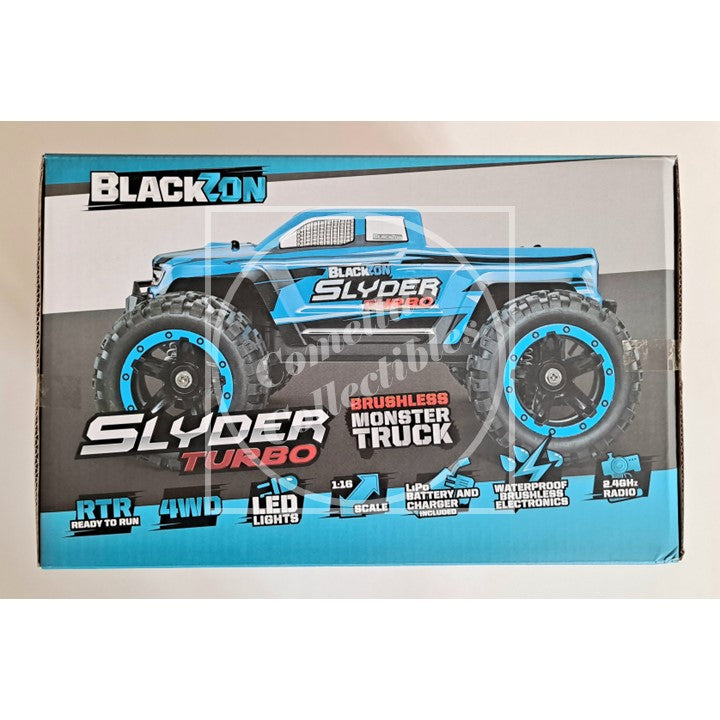 BlackZon Slyder Turbo 1:16 Monster Truck Blue RTR Brushless Combo 4WD with LEDs 2.4GHz Tx Battery and Charger #540201 in factory sealed retail box.
