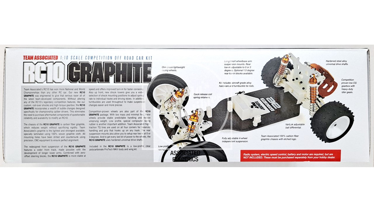 Team Associated's RC10 has won more National and World Championships than any other RC car. The new RC10 GRAPHITE was engineered to give that serious racer all of the latest team-developed components. Without altering any of the RC10’s legendary competition features, like the custom, coil-over shocks and high-torque gearbox; the RC10 GRAPHITE incorporates a wealth of subtle changes designed specifically for championship caliber drivers. This eliminates the need to purchase aftermarket components of questionable reliability and availability to modify an RC10.