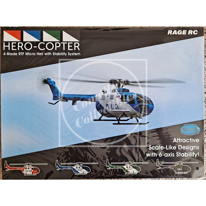 The Hero-Copter is the next Rage RC helicopter that takes the ease of flying a micro heli to a whole new level. This new scale-like heli is equipped with all the features that make RC drones easy to fly, such as 6-axis flight control, auto take-off and land, altitude hold, plus three flight modes (beginner, intermediate, and advanced) that make it fun to fly for pilots of all skill levels. A coreless main motor provides plenty of power and 2-gram digital servos provide precision and responsive control. The Hero-Copter provides long flight times of over 15 minutes due to the safe, convenient 2S 350mAh plug-in battery so you can maximize your flying time indoors (in appropriately sized spaces) or outdoors in little to no wind.
