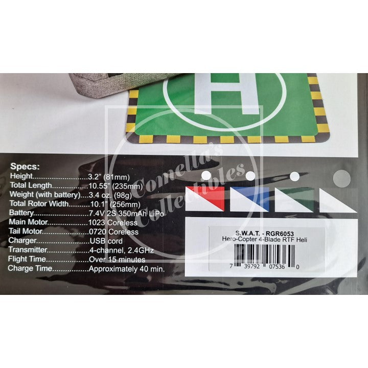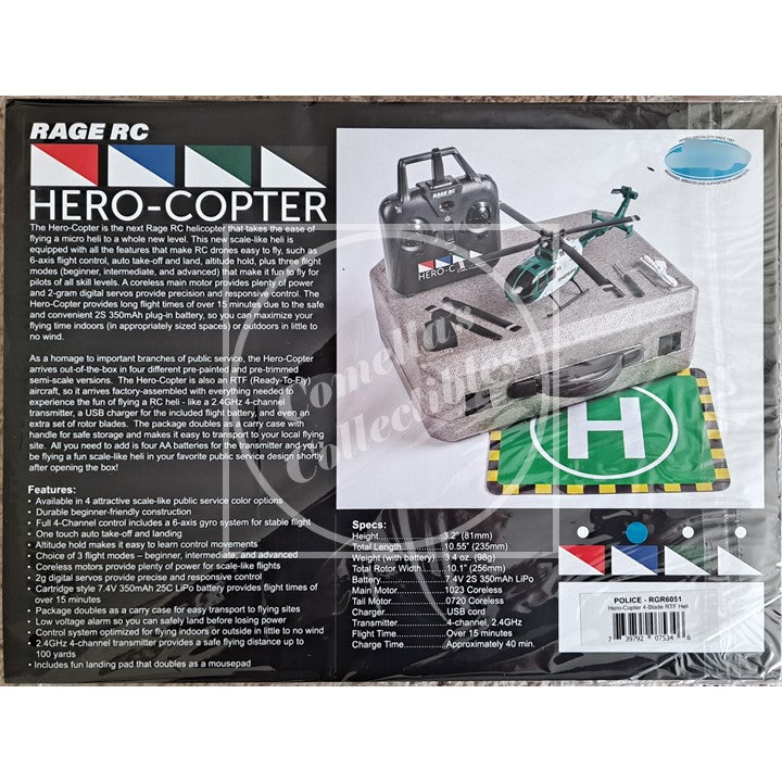 As a homage to important branches of public service, the Hero-Copter arrives out-of-the-box in one of four different pre-painted and pre-trimmed semi-scale versions. The Hero-Copter is also a RTF (Ready-To-Fly) aircraft, so it arrives factory-assembled with everything needed to experience the fun of flying a RC heli - like a 2.4GHz 4-channel transmitter, a USB charger for the included flight battery, and even an extra set of rotor blades. The package doubles as a carry case with handle for safe storage and makes it easy to transport to your local flying site. The only thing you need to add is four AA batteries for the transmitter and you'll be flying a fun scale-like heli in your favorite public service design shortly after opening the box!