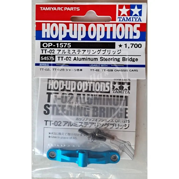 Genuine Tamiya Hop-Up TT-02 Aluminum Steering Bridge OP-1575 #54575 in factory sealed retail package.