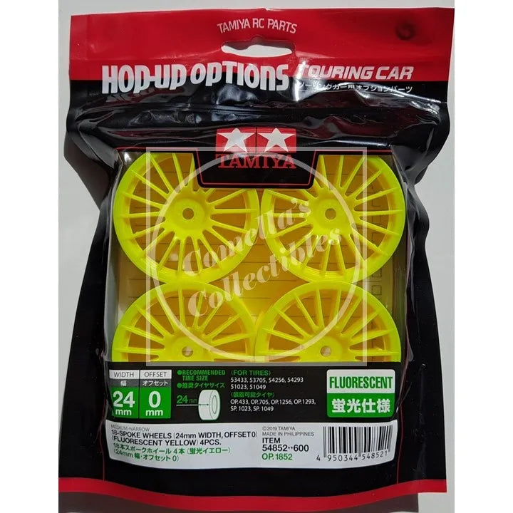 Tamiya Hop-Up Medium-Narrow 18 Spoke Rally Wheels (24mm Width, Offset 0) (Fluorescent Yellow) 4 pcs #54852 OP-1852 in factory sealed retail package.