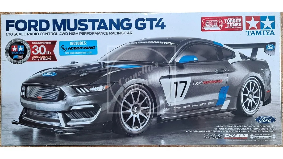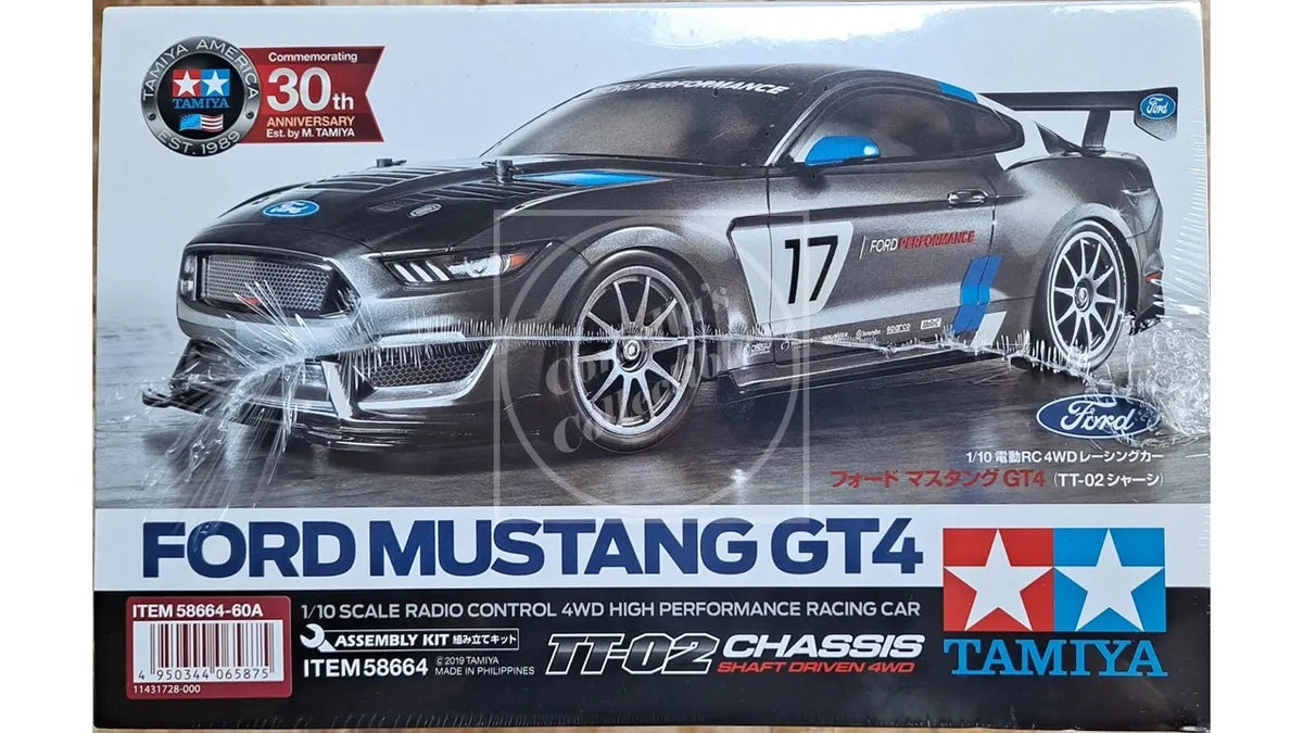 Tamiya 1/10 Ford Mustang GT4 4WD Race Unassembled Kit with RS-540 Motor, Brushed ESC and TT-02 Chassis #58664 in factory sealed retail box.