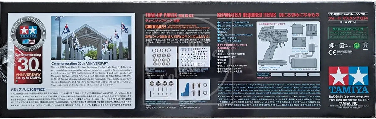 This is a 1:10 scale RC replica of the Ford Mustang GT4. This is a very special commemorative edition not only celebrating Tamiya America's establishment in 1989, but in honor of the company's beloved founder, Mr. Masayuki Tamiya. Tamiya America's staff, and countless RC hobbyists around the world, continue to move forward thanks to Mr. M. Tamiya's legacy, which includes hard work, implementation of new ideas, adaptation, and his thirst for learning about the world around us. Your leadership and influence continue with us every day.