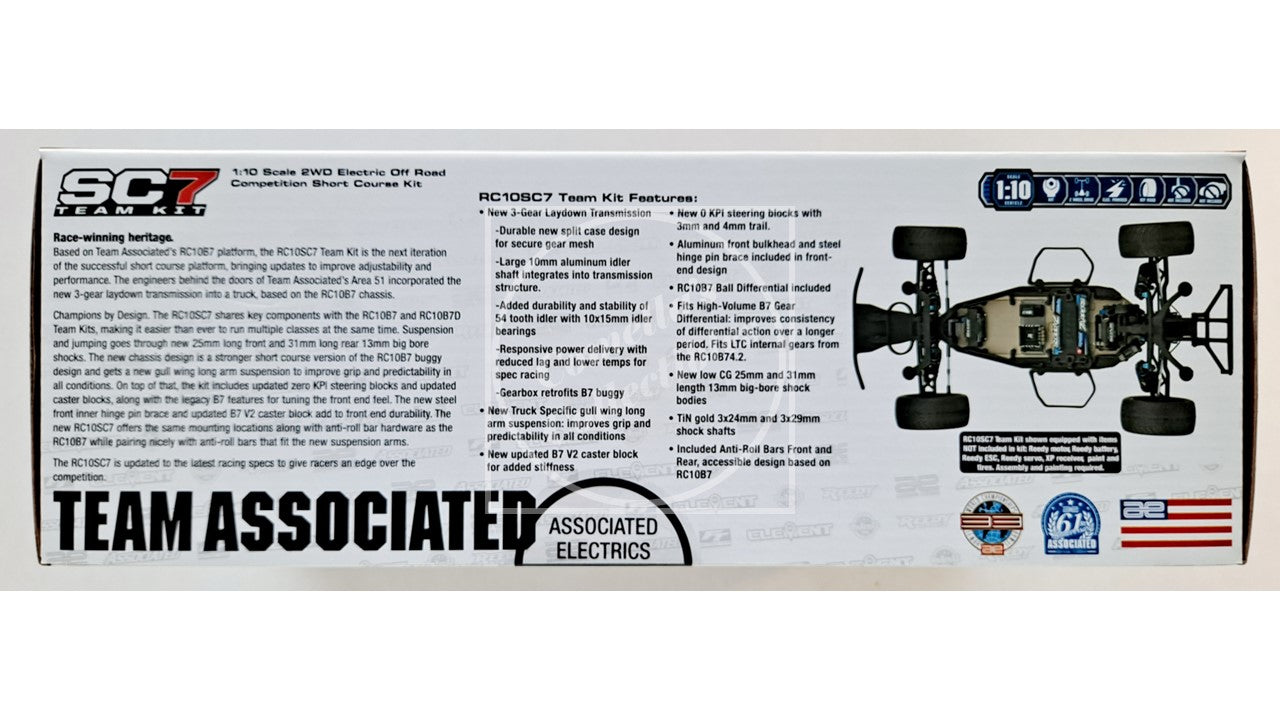Based on Team Associated’s RC10B7 platform, the RC10SC7 Team Kit is the next iteration of the successful short course platform. Design goals were to lower CG, add durability, and incorporate the RC10B7 adjustability and performance. Engineers inside Team Associated’s Area 51 first priority was the design of the new 3-gear laydown transmission to reduce drag and transfer all of the power to the larger short course truck tires.